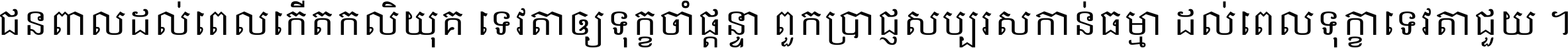 ជនពាល​ដល់​ពេល​កើត​កលិយុគ ទេវតា​ឲ្យ​ទុក្ខ​ចាំ​ផ្ដន្ទា ពួក​ប្រាជ្ញ​សប្បរស​កាន់​ធម្មា ដល់​ពេល​ទុក្ខា​ទេវតា​ជួយ ។