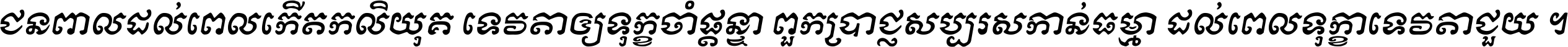 ជនពាល​ដល់​ពេល​កើត​កលិយុគ ទេវតា​ឲ្យ​ទុក្ខ​ចាំ​ផ្ដន្ទា ពួក​ប្រាជ្ញ​សប្បរស​កាន់​ធម្មា ដល់​ពេល​ទុក្ខា​ទេវតា​ជួយ ។