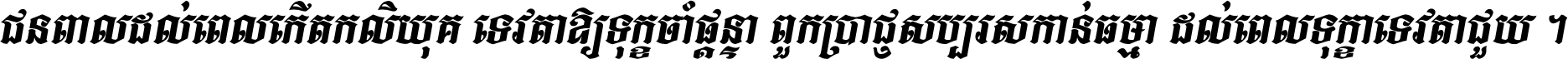 ជនពាល​ដល់​ពេល​កើត​កលិយុគ ទេវតា​ឲ្យ​ទុក្ខ​ចាំ​ផ្ដន្ទា ពួក​ប្រាជ្ញ​សប្បរស​កាន់​ធម្មា ដល់​ពេល​ទុក្ខា​ទេវតា​ជួយ ។