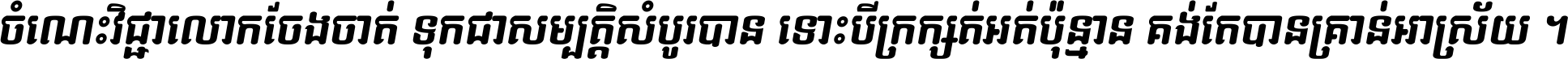 ចំណេះ​វិជ្ជា​លោក​ចែង​ចាត់ ទុក​ជា​សម្បត្តិ​សំបូរ​បាន ទោះ​បី​ក្រក្សត់​អត់​ប៉ុន្មាន គង់​តែ​បាន​គ្រាន់​អាស្រ័យ ។