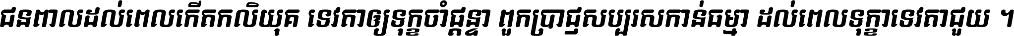 ជនពាល​ដល់​ពេល​កើត​កលិយុគ ទេវតា​ឲ្យ​ទុក្ខ​ចាំ​ផ្ដន្ទា ពួក​ប្រាជ្ញ​សប្បរស​កាន់​ធម្មា ដល់​ពេល​ទុក្ខា​ទេវតា​ជួយ ។