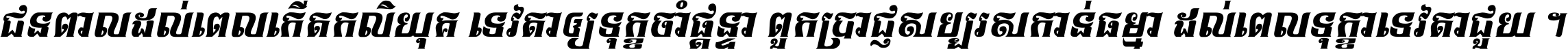 ជនពាល​ដល់​ពេល​កើត​កលិយុគ ទេវតា​ឲ្យ​ទុក្ខ​ចាំ​ផ្ដន្ទា ពួក​ប្រាជ្ញ​សប្បរស​កាន់​ធម្មា ដល់​ពេល​ទុក្ខា​ទេវតា​ជួយ ។