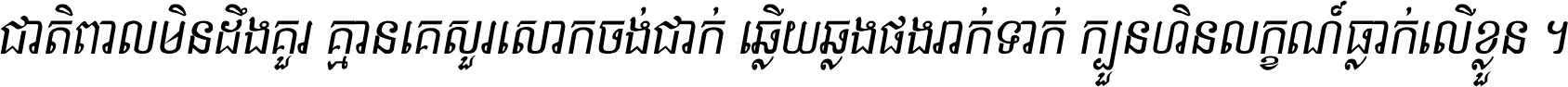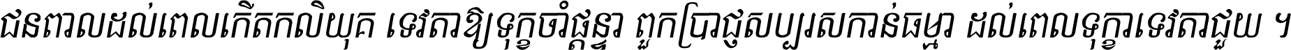ជនពាល​ដល់​ពេល​កើត​កលិយុគ ទេវតា​ឲ្យ​ទុក្ខ​ចាំ​ផ្ដន្ទា ពួក​ប្រាជ្ញ​សប្បរស​កាន់​ធម្មា ដល់​ពេល​ទុក្ខា​ទេវតា​ជួយ ។