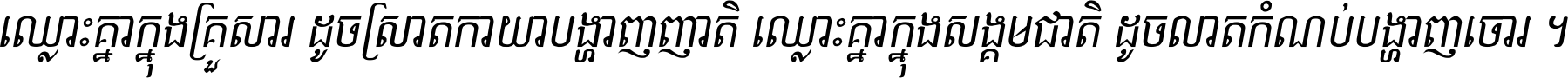 ឈ្លោះ​គ្នា​ក្នុង​គ្រួសារ ដូច​ស្រាត​កាយា​បង្ហាញ​ញាតិ ឈ្លោះគ្នាក្នុង​សង្គមជាតិ ដូច​លាត​កំណប់​បង្ហាញ​ចោរ ។