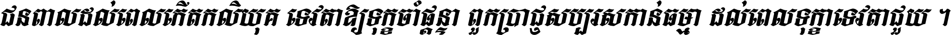 ជនពាល​ដល់​ពេល​កើត​កលិយុគ ទេវតា​ឲ្យ​ទុក្ខ​ចាំ​ផ្ដន្ទា ពួក​ប្រាជ្ញ​សប្បរស​កាន់​ធម្មា ដល់​ពេល​ទុក្ខា​ទេវតា​ជួយ ។