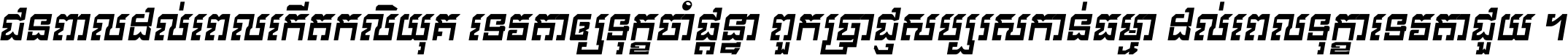 ជនពាល​ដល់​ពេល​កើត​កលិយុគ ទេវតា​ឲ្យ​ទុក្ខ​ចាំ​ផ្ដន្ទា ពួក​ប្រាជ្ញ​សប្បរស​កាន់​ធម្មា ដល់​ពេល​ទុក្ខា​ទេវតា​ជួយ ។