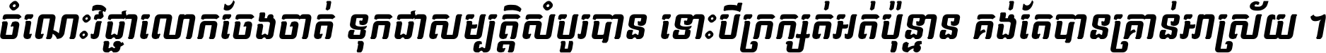 ចំណេះ​វិជ្ជា​លោក​ចែង​ចាត់ ទុក​ជា​សម្បត្តិ​សំបូរ​បាន ទោះ​បី​ក្រក្សត់​អត់​ប៉ុន្មាន គង់​តែ​បាន​គ្រាន់​អាស្រ័យ ។