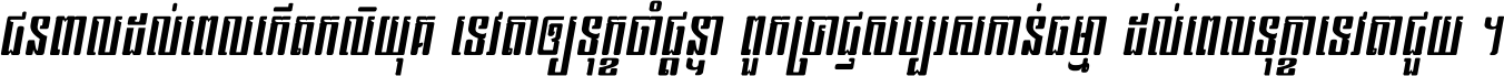 ជនពាល​ដល់​ពេល​កើត​កលិយុគ ទេវតា​ឲ្យ​ទុក្ខ​ចាំ​ផ្ដន្ទា ពួក​ប្រាជ្ញ​សប្បរស​កាន់​ធម្មា ដល់​ពេល​ទុក្ខា​ទេវតា​ជួយ ។
