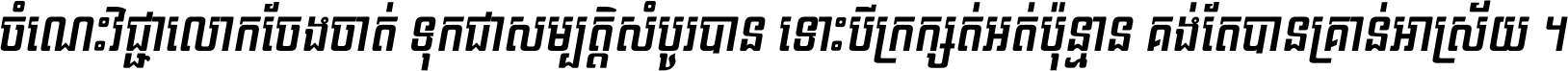 ចំណេះ​វិជ្ជា​លោក​ចែង​ចាត់ ទុក​ជា​សម្បត្តិ​សំបូរ​បាន ទោះ​បី​ក្រក្សត់​អត់​ប៉ុន្មាន គង់​តែ​បាន​គ្រាន់​អាស្រ័យ ។
