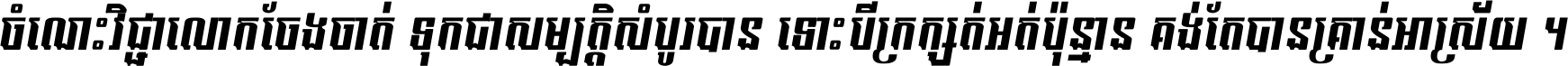 ចំណេះ​វិជ្ជា​លោក​ចែង​ចាត់ ទុក​ជា​សម្បត្តិ​សំបូរ​បាន ទោះ​បី​ក្រក្សត់​អត់​ប៉ុន្មាន គង់​តែ​បាន​គ្រាន់​អាស្រ័យ ។