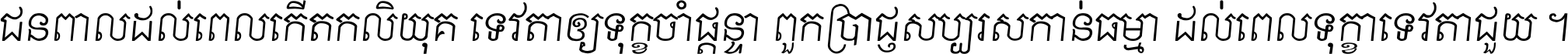 ជនពាល​ដល់​ពេល​កើត​កលិយុគ ទេវតា​ឲ្យ​ទុក្ខ​ចាំ​ផ្ដន្ទា ពួក​ប្រាជ្ញ​សប្បរស​កាន់​ធម្មា ដល់​ពេល​ទុក្ខា​ទេវតា​ជួយ ។