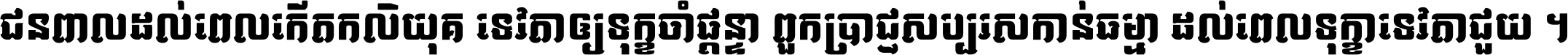 ជនពាល​ដល់​ពេល​កើត​កលិយុគ ទេវតា​ឲ្យ​ទុក្ខ​ចាំ​ផ្ដន្ទា ពួក​ប្រាជ្ញ​សប្បរស​កាន់​ធម្មា ដល់​ពេល​ទុក្ខា​ទេវតា​ជួយ ។