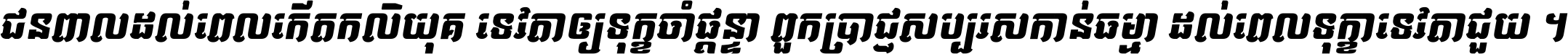 ជនពាល​ដល់​ពេល​កើត​កលិយុគ ទេវតា​ឲ្យ​ទុក្ខ​ចាំ​ផ្ដន្ទា ពួក​ប្រាជ្ញ​សប្បរស​កាន់​ធម្មា ដល់​ពេល​ទុក្ខា​ទេវតា​ជួយ ។
