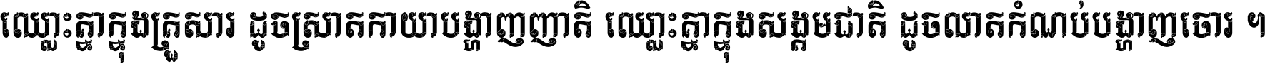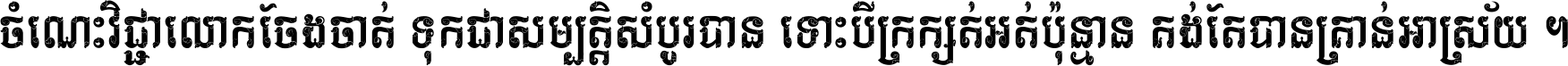 ចំណេះ​វិជ្ជា​លោក​ចែង​ចាត់ ទុក​ជា​សម្បត្តិ​សំបូរ​បាន ទោះ​បី​ក្រក្សត់​អត់​ប៉ុន្មាន គង់​តែ​បាន​គ្រាន់​អាស្រ័យ ។