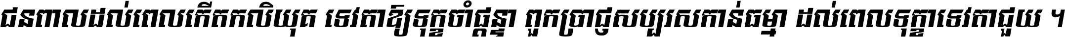 ជនពាល​ដល់​ពេល​កើត​កលិយុគ ទេវតា​ឲ្យ​ទុក្ខ​ចាំ​ផ្ដន្ទា ពួក​ប្រាជ្ញ​សប្បរស​កាន់​ធម្មា ដល់​ពេល​ទុក្ខា​ទេវតា​ជួយ ។