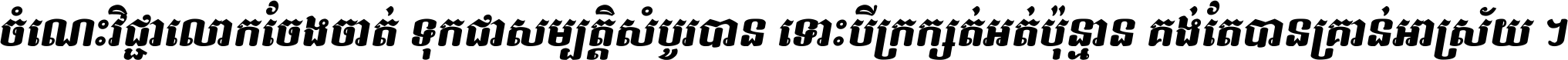 ចំណេះ​វិជ្ជា​លោក​ចែង​ចាត់ ទុក​ជា​សម្បត្តិ​សំបូរ​បាន ទោះ​បី​ក្រក្សត់​អត់​ប៉ុន្មាន គង់​តែ​បាន​គ្រាន់​អាស្រ័យ ។