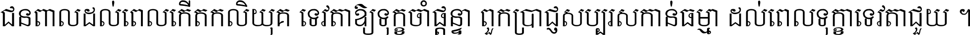 ជនពាល​ដល់​ពេល​កើត​កលិយុគ ទេវតា​ឲ្យ​ទុក្ខ​ចាំ​ផ្ដន្ទា ពួក​ប្រាជ្ញ​សប្បរស​កាន់​ធម្មា ដល់​ពេល​ទុក្ខា​ទេវតា​ជួយ ។