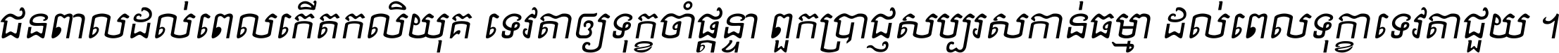 ជនពាល​ដល់​ពេល​កើត​កលិយុគ ទេវតា​ឲ្យ​ទុក្ខ​ចាំ​ផ្ដន្ទា ពួក​ប្រាជ្ញ​សប្បរស​កាន់​ធម្មា ដល់​ពេល​ទុក្ខា​ទេវតា​ជួយ ។