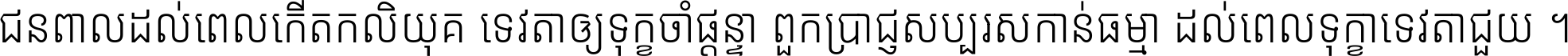 ជនពាល​ដល់​ពេល​កើត​កលិយុគ ទេវតា​ឲ្យ​ទុក្ខ​ចាំ​ផ្ដន្ទា ពួក​ប្រាជ្ញ​សប្បរស​កាន់​ធម្មា ដល់​ពេល​ទុក្ខា​ទេវតា​ជួយ ។