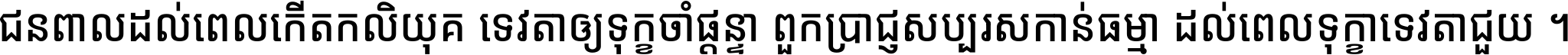 ជនពាល​ដល់​ពេល​កើត​កលិយុគ ទេវតា​ឲ្យ​ទុក្ខ​ចាំ​ផ្ដន្ទា ពួក​ប្រាជ្ញ​សប្បរស​កាន់​ធម្មា ដល់​ពេល​ទុក្ខា​ទេវតា​ជួយ ។