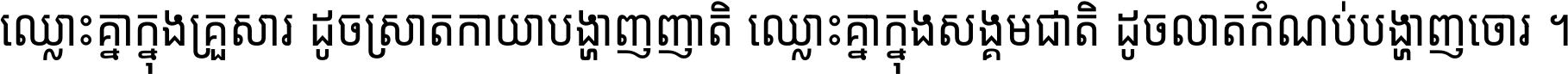 ឈ្លោះ​គ្នា​ក្នុង​គ្រួសារ ដូច​ស្រាត​កាយា​បង្ហាញ​ញាតិ ឈ្លោះគ្នាក្នុង​សង្គមជាតិ ដូច​លាត​កំណប់​បង្ហាញ​ចោរ ។