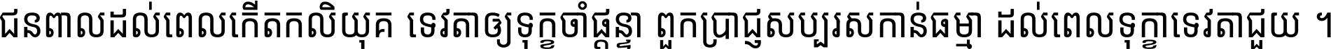 ជនពាល​ដល់​ពេល​កើត​កលិយុគ ទេវតា​ឲ្យ​ទុក្ខ​ចាំ​ផ្ដន្ទា ពួក​ប្រាជ្ញ​សប្បរស​កាន់​ធម្មា ដល់​ពេល​ទុក្ខា​ទេវតា​ជួយ ។