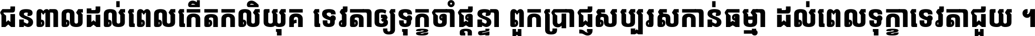 ជនពាល​ដល់​ពេល​កើត​កលិយុគ ទេវតា​ឲ្យ​ទុក្ខ​ចាំ​ផ្ដន្ទា ពួក​ប្រាជ្ញ​សប្បរស​កាន់​ធម្មា ដល់​ពេល​ទុក្ខា​ទេវតា​ជួយ ។
