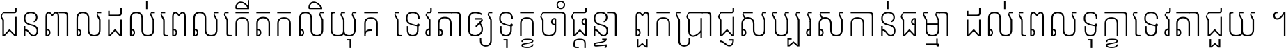 ជនពាល​ដល់​ពេល​កើត​កលិយុគ ទេវតា​ឲ្យ​ទុក្ខ​ចាំ​ផ្ដន្ទា ពួក​ប្រាជ្ញ​សប្បរស​កាន់​ធម្មា ដល់​ពេល​ទុក្ខា​ទេវតា​ជួយ ។