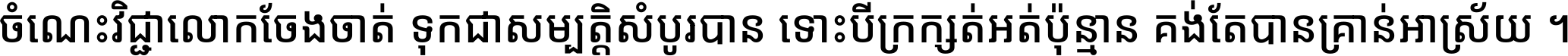 ចំណេះ​វិជ្ជា​លោក​ចែង​ចាត់ ទុក​ជា​សម្បត្តិ​សំបូរ​បាន ទោះ​បី​ក្រក្សត់​អត់​ប៉ុន្មាន គង់​តែ​បាន​គ្រាន់​អាស្រ័យ ។