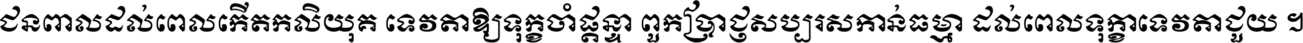 ជនពាល​ដល់​ពេល​កើត​កលិយុគ ទេវតា​ឲ្យ​ទុក្ខ​ចាំ​ផ្ដន្ទា ពួក​ប្រាជ្ញ​សប្បរស​កាន់​ធម្មា ដល់​ពេល​ទុក្ខា​ទេវតា​ជួយ ។