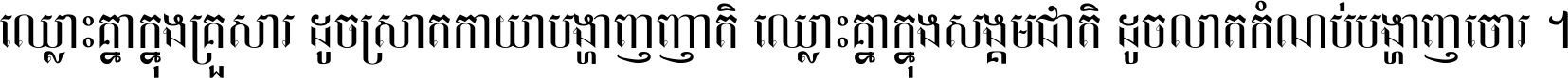 ឈ្លោះ​គ្នា​ក្នុង​គ្រួសារ ដូច​ស្រាត​កាយា​បង្ហាញ​ញាតិ ឈ្លោះគ្នាក្នុង​សង្គមជាតិ ដូច​លាត​កំណប់​បង្ហាញ​ចោរ ។