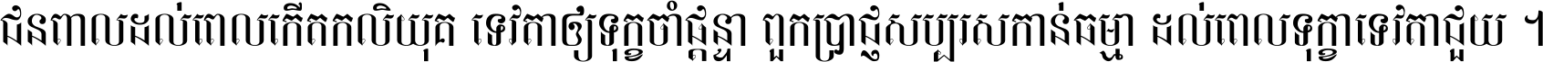 ជនពាល​ដល់​ពេល​កើត​កលិយុគ ទេវតា​ឲ្យ​ទុក្ខ​ចាំ​ផ្ដន្ទា ពួក​ប្រាជ្ញ​សប្បរស​កាន់​ធម្មា ដល់​ពេល​ទុក្ខា​ទេវតា​ជួយ ។
