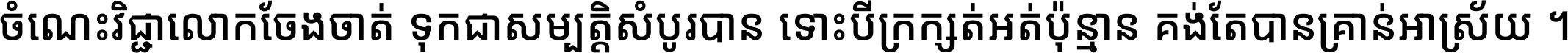 ចំណេះ​វិជ្ជា​លោក​ចែង​ចាត់ ទុក​ជា​សម្បត្តិ​សំបូរ​បាន ទោះ​បី​ក្រក្សត់​អត់​ប៉ុន្មាន គង់​តែ​បាន​គ្រាន់​អាស្រ័យ ។