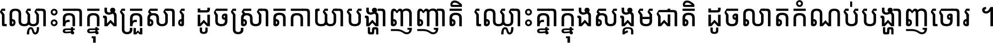 ឈ្លោះ​គ្នា​ក្នុង​គ្រួសារ ដូច​ស្រាត​កាយា​បង្ហាញ​ញាតិ ឈ្លោះគ្នាក្នុង​សង្គមជាតិ ដូច​លាត​កំណប់​បង្ហាញ​ចោរ ។