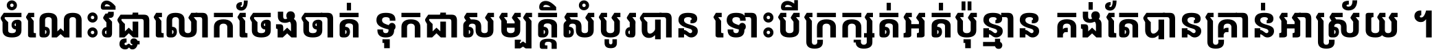 ចំណេះ​វិជ្ជា​លោក​ចែង​ចាត់ ទុក​ជា​សម្បត្តិ​សំបូរ​បាន ទោះ​បី​ក្រក្សត់​អត់​ប៉ុន្មាន គង់​តែ​បាន​គ្រាន់​អាស្រ័យ ។
