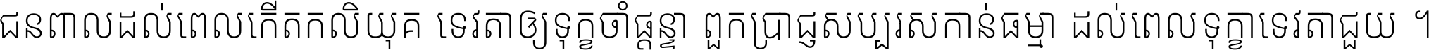 ជនពាល​ដល់​ពេល​កើត​កលិយុគ ទេវតា​ឲ្យ​ទុក្ខ​ចាំ​ផ្ដន្ទា ពួក​ប្រាជ្ញ​សប្បរស​កាន់​ធម្មា ដល់​ពេល​ទុក្ខា​ទេវតា​ជួយ ។