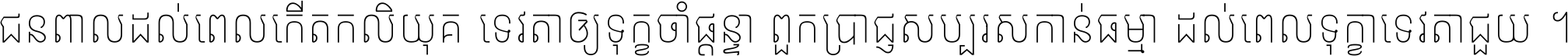 ជនពាល​ដល់​ពេល​កើត​កលិយុគ ទេវតា​ឲ្យ​ទុក្ខ​ចាំ​ផ្ដន្ទា ពួក​ប្រាជ្ញ​សប្បរស​កាន់​ធម្មា ដល់​ពេល​ទុក្ខា​ទេវតា​ជួយ ។