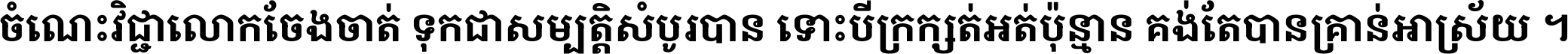 ចំណេះ​វិជ្ជា​លោក​ចែង​ចាត់ ទុក​ជា​សម្បត្តិ​សំបូរ​បាន ទោះ​បី​ក្រក្សត់​អត់​ប៉ុន្មាន គង់​តែ​បាន​គ្រាន់​អាស្រ័យ ។