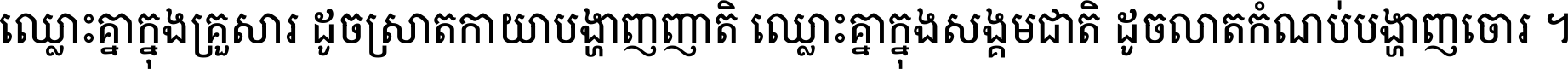 ឈ្លោះ​គ្នា​ក្នុង​គ្រួសារ ដូច​ស្រាត​កាយា​បង្ហាញ​ញាតិ ឈ្លោះគ្នាក្នុង​សង្គមជាតិ ដូច​លាត​កំណប់​បង្ហាញ​ចោរ ។