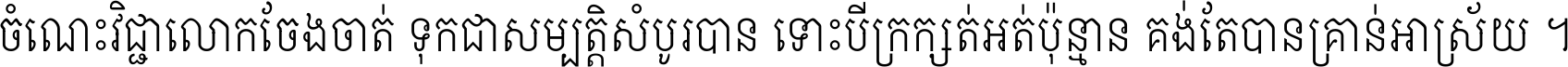 ចំណេះ​វិជ្ជា​លោក​ចែង​ចាត់ ទុក​ជា​សម្បត្តិ​សំបូរ​បាន ទោះ​បី​ក្រក្សត់​អត់​ប៉ុន្មាន គង់​តែ​បាន​គ្រាន់​អាស្រ័យ ។