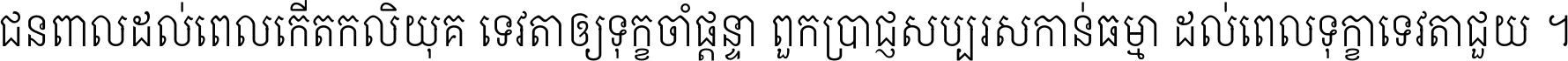 ជនពាល​ដល់​ពេល​កើត​កលិយុគ ទេវតា​ឲ្យ​ទុក្ខ​ចាំ​ផ្ដន្ទា ពួក​ប្រាជ្ញ​សប្បរស​កាន់​ធម្មា ដល់​ពេល​ទុក្ខា​ទេវតា​ជួយ ។