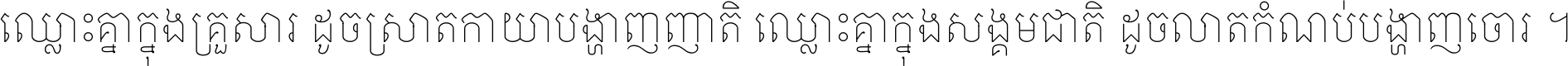 ចង​អ្វី​មិន​ជាប់​ស្មើ​សង្សារ ការ​អ្វី​មិន​ស្មើ​ការ​ប្រតិបត្តិ ស្ងាត់​អ្វី​មិន​ស្មើ​​ចិត្ត​អរហត្ត​ កាច​អ្វី​មិន​ស្មើ​ចិត្ត​ពាលា ។