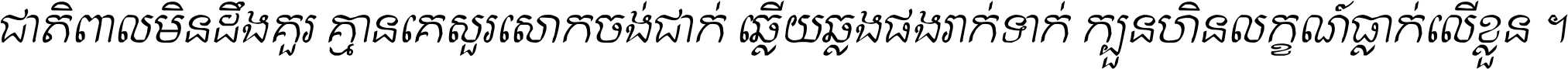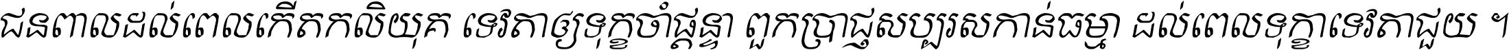 ជនពាល​ដល់​ពេល​កើត​កលិយុគ ទេវតា​ឲ្យ​ទុក្ខ​ចាំ​ផ្ដន្ទា ពួក​ប្រាជ្ញ​សប្បរស​កាន់​ធម្មា ដល់​ពេល​ទុក្ខា​ទេវតា​ជួយ ។