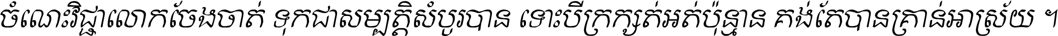 ចំណេះ​វិជ្ជា​លោក​ចែង​ចាត់ ទុក​ជា​សម្បត្តិ​សំបូរ​បាន ទោះ​បី​ក្រក្សត់​អត់​ប៉ុន្មាន គង់​តែ​បាន​គ្រាន់​អាស្រ័យ ។