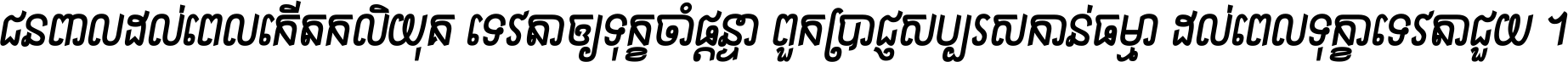 ជនពាល​ដល់​ពេល​កើត​កលិយុគ ទេវតា​ឲ្យ​ទុក្ខ​ចាំ​ផ្ដន្ទា ពួក​ប្រាជ្ញ​សប្បរស​កាន់​ធម្មា ដល់​ពេល​ទុក្ខា​ទេវតា​ជួយ ។
