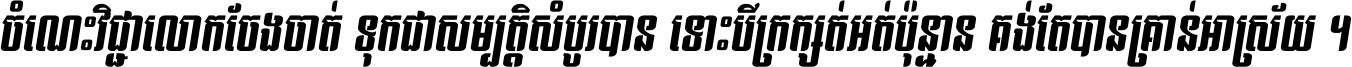 ចំណេះ​វិជ្ជា​លោក​ចែង​ចាត់ ទុក​ជា​សម្បត្តិ​សំបូរ​បាន ទោះ​បី​ក្រក្សត់​អត់​ប៉ុន្មាន គង់​តែ​បាន​គ្រាន់​អាស្រ័យ ។