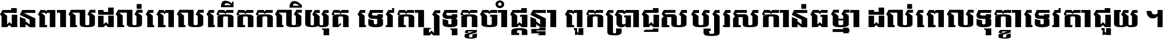 ជនពាល​ដល់​ពេល​កើត​កលិយុគ ទេវតា​ឲ្យ​ទុក្ខ​ចាំ​ផ្ដន្ទា ពួក​ប្រាជ្ញ​សប្បរស​កាន់​ធម្មា ដល់​ពេល​ទុក្ខា​ទេវតា​ជួយ ។