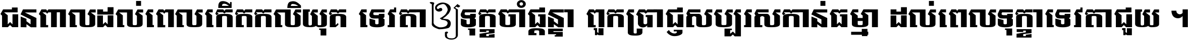 ជនពាល​ដល់​ពេល​កើត​កលិយុគ ទេវតា​ឲ្យ​ទុក្ខ​ចាំ​ផ្ដន្ទា ពួក​ប្រាជ្ញ​សប្បរស​កាន់​ធម្មា ដល់​ពេល​ទុក្ខា​ទេវតា​ជួយ ។